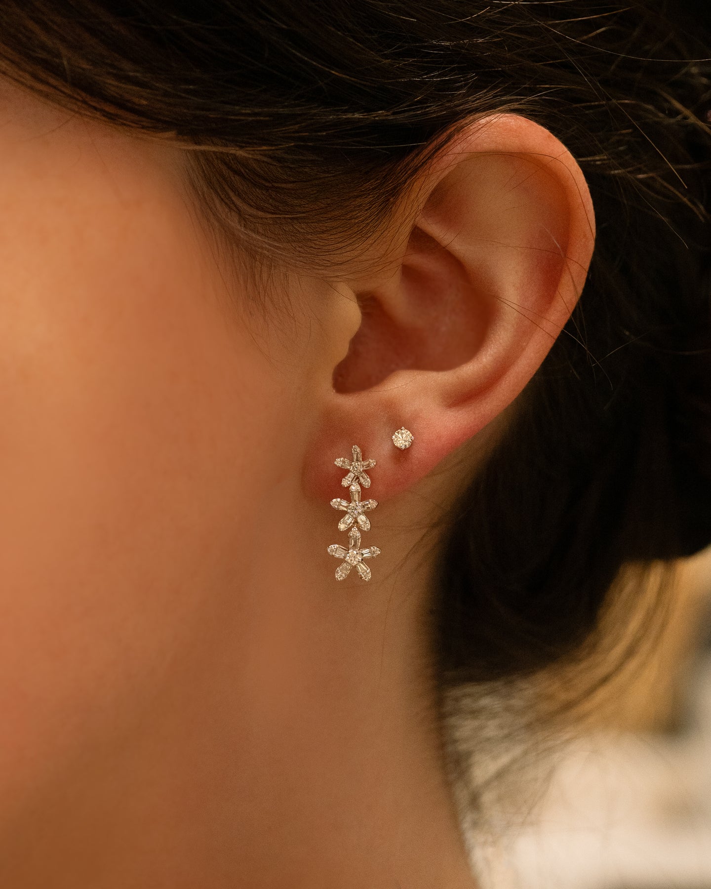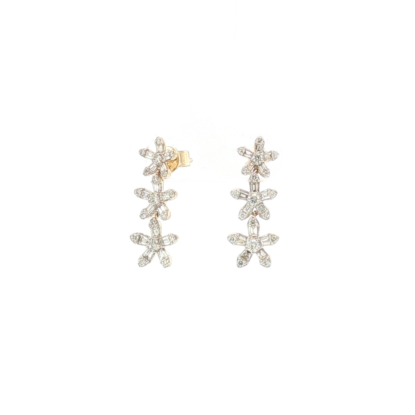 Feminine, playful and sparkly, these gorgeous diamond drop earrings feature three diamond encrusted flowers, set in yellow gold, graduating in size with each drop. Each flower is made up of tapered baguette diamonds and round brilliant cut diamonds, set in 9ct yellow gold. 66 diamonds in total and with a total weight of 0.68ctw. The earring drop is 20mm. These are the perfect choice for earring lovers.