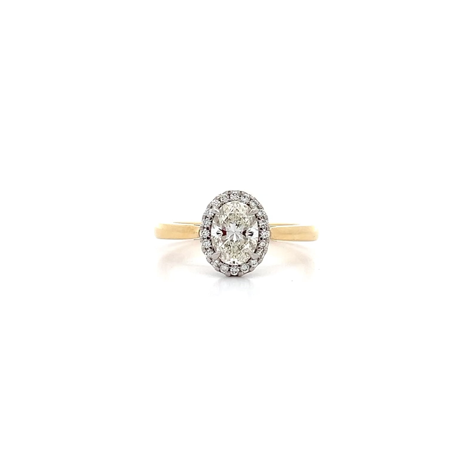 Crafted in 18ct yellow gold and platinum, it features a 0.90ct oval-cut diamond of J colour and SI clarity. The centre diamond is surrounded by 20 brilliant cut diamonds of D-G colour, VS-SI clarity, and with a total weight of 0.12ct.