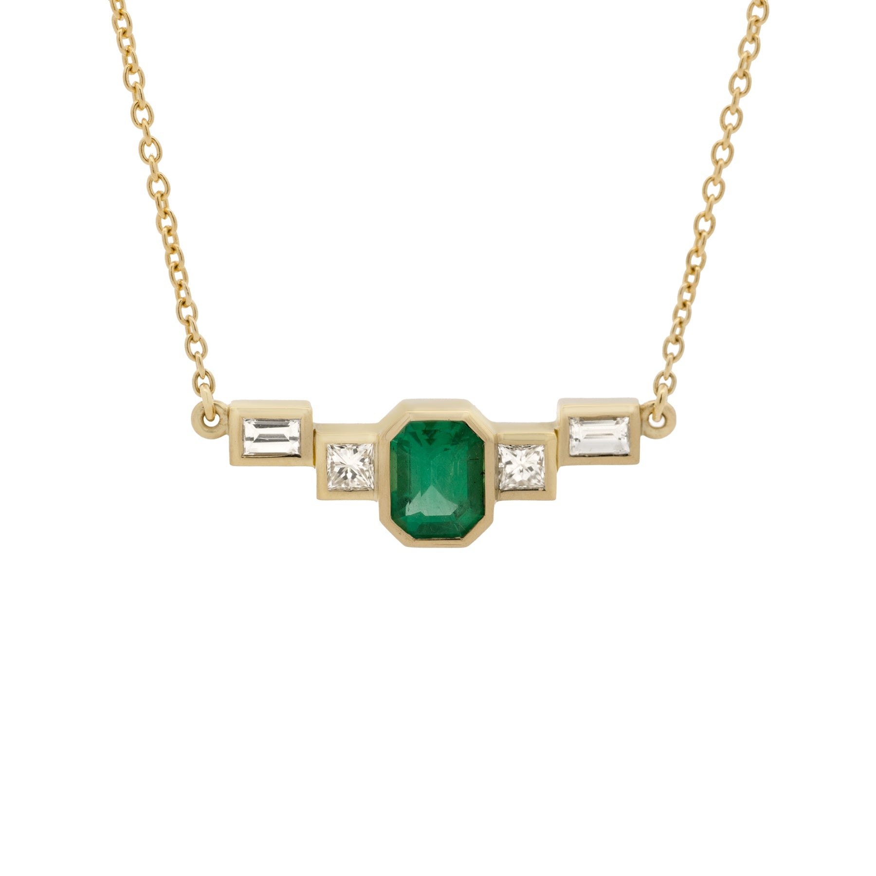 Crafted in 18ct yellow gold, this pendant showcases a striking 0.54ct octangonal cut emerald at its centre, paired with two princess cut diamonds and two baguette cut diamonds. The diamonds are D-G colour, VS-SI clarity, totalling 0.33ct and all bezel set. The pendant is suspended on a 45cm 18ct yellow gold chain.