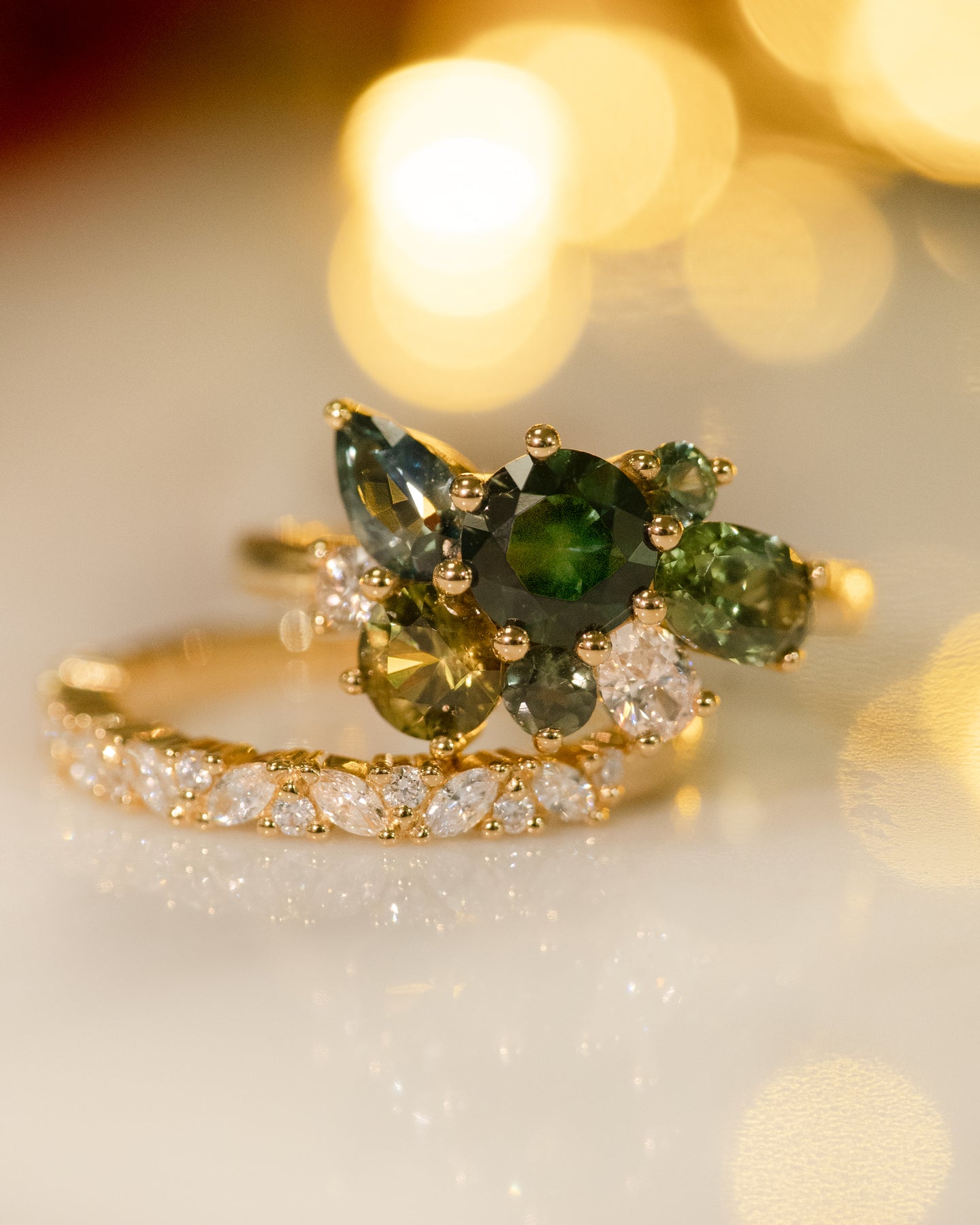 Inspired by Mother Nature's beauty, this sapphire and diamond cluster ring showcases an array of green hues complemented by 18ct yellow gold. It features an assortment of round, oval and pear cut green sapphires totalling 2.75ct and two dazzling white diamonds, totalling 0.20ct.