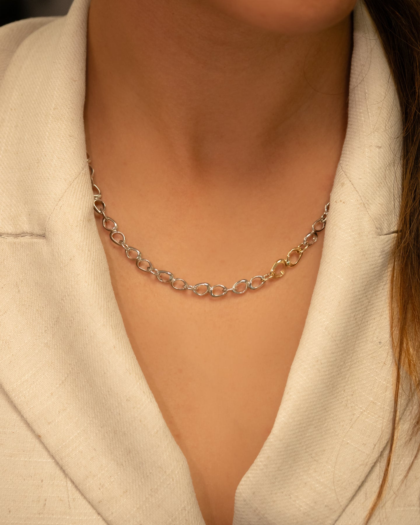 The unique link design of the Staccato necklace takes its cue from the clear and distinctive movement of Staccato in music. Crafted in sterling silver with a pop 9ct yellow gold, each link is clean and defined, creating a lively yet timeless chain with a unique character. Designed by The Village Goldsmiths in house, award-winning jewellery designers, each piece from the Symphony collection is inspired by rhythm, flow, and emotion of musical expression.