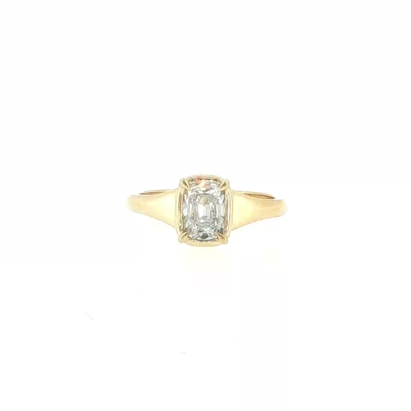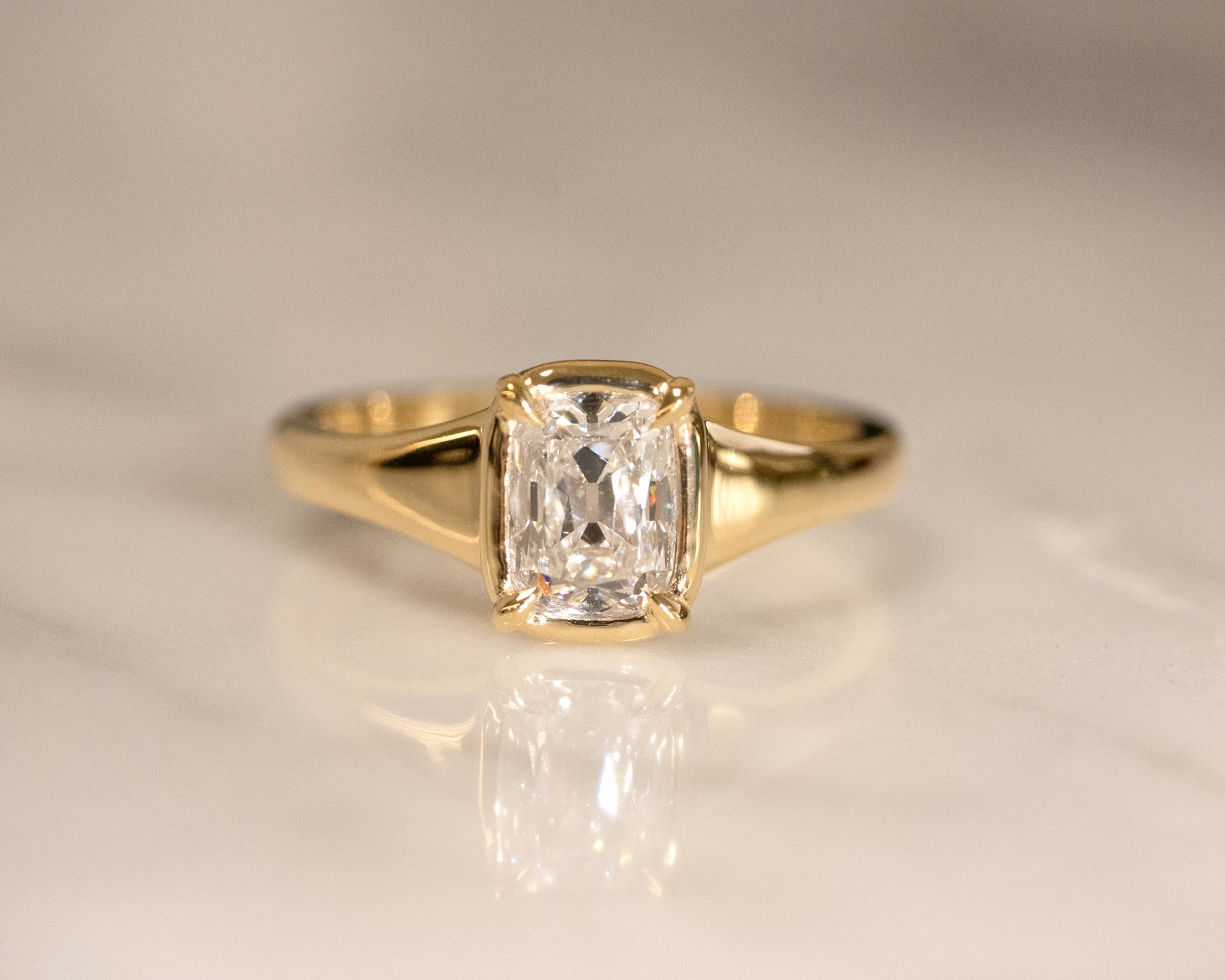 Its old mine cut diamond, with its larger facets, offers a soft, gentle glow that feels beautifully understated. Crafted in 18ct yellow gold, the ring has been thoughtfully designed to allow a straight wedding band to sit perfectly beneath it without rubbing. Featuring a 1.02ct old mine cut diamond in F colour and SI1 clarity, it is set in a graceful semi‑bezel claw setting.