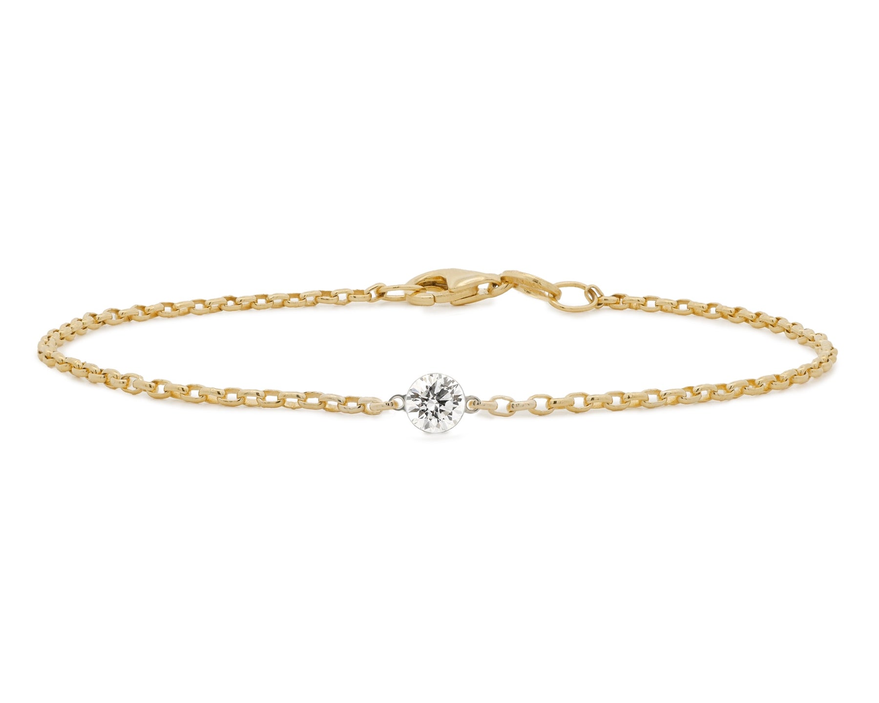Featuring a 0.27ct patented Floeting® Diamond of F colour and VS1 clarity. The diamond is secured in a scientifically tested setting made using a specialist titanium alloy and paired with platinum. The oval belcher bracelet is crafted from 9ct yellow gold and measures 18.5cm in length.