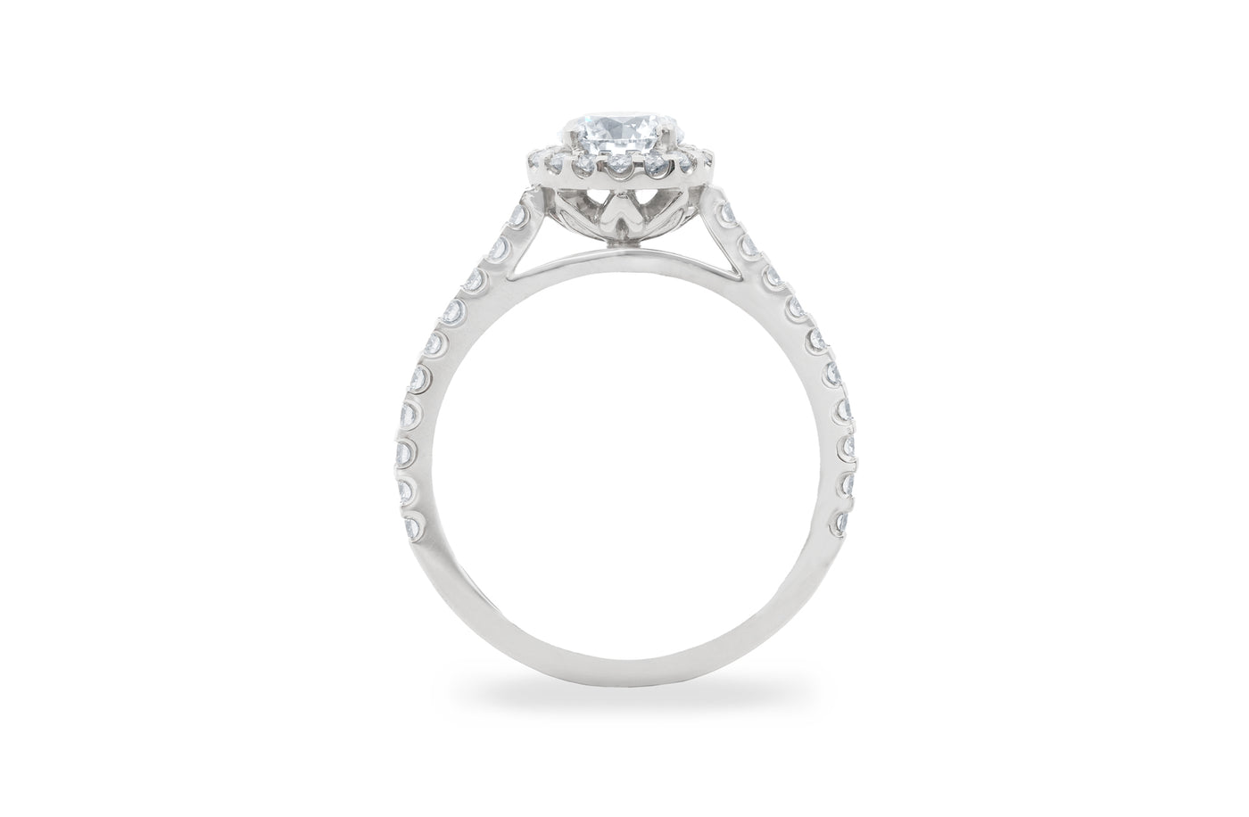 This ring starts from using a 0.30ct round brilliant cut centre diamond surrounded by round brilliant diamonds in the halo and band. The size and number of the halo diamonds will be adjusted accordingly to match the centre diamond size.