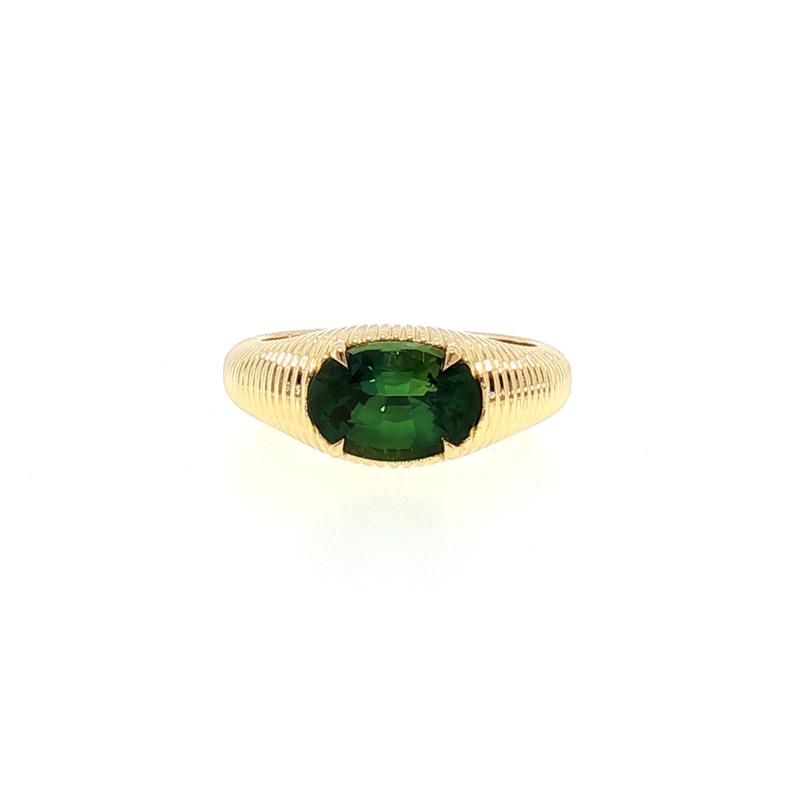 This simply exquisite ring is crafted in 18ct yellow gold and features a unique rounded, ribbed design that has both depth and presence. A rich jungle green 3.04ct oval-cut sapphire takes centre stage in an east–west setting, giving the piece a distinctive and modern charm. Green sapphire is often associated with nature, growth, and strength, enhancing beautiful meaning behind this wonderful design.